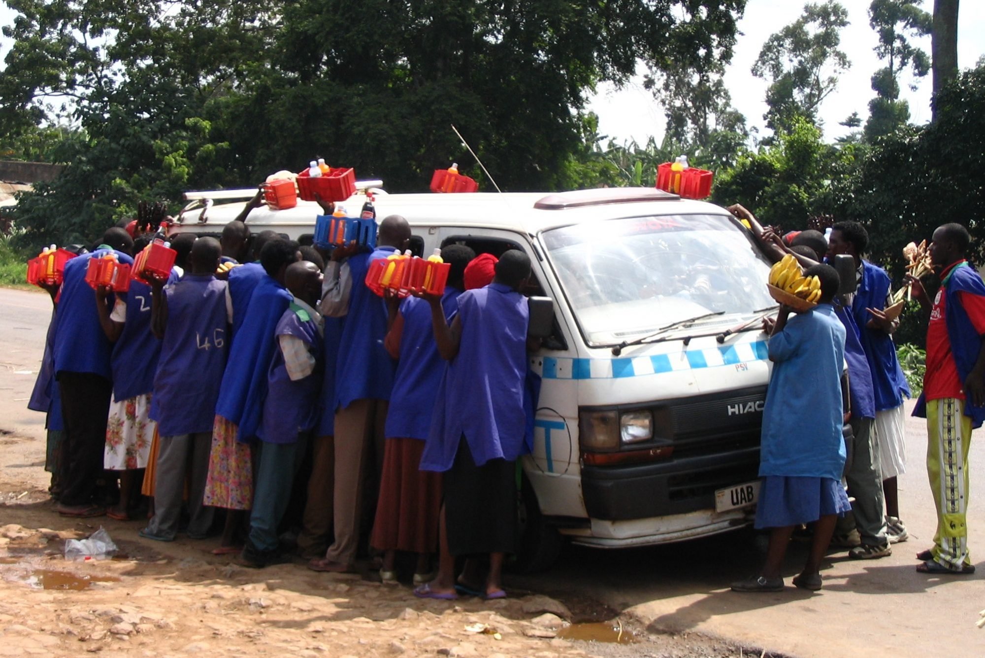 All you need to do is pull your vehicle over to the side of the road and you will very quickly be surrounded by people dressed in blue aprons with numbers on them. They will be carrying a variety of items from water, fanta, soda, ngonga (roasted banana wrapped in newspaper), meat on a stick, bananas and the famous chicken on a stick.